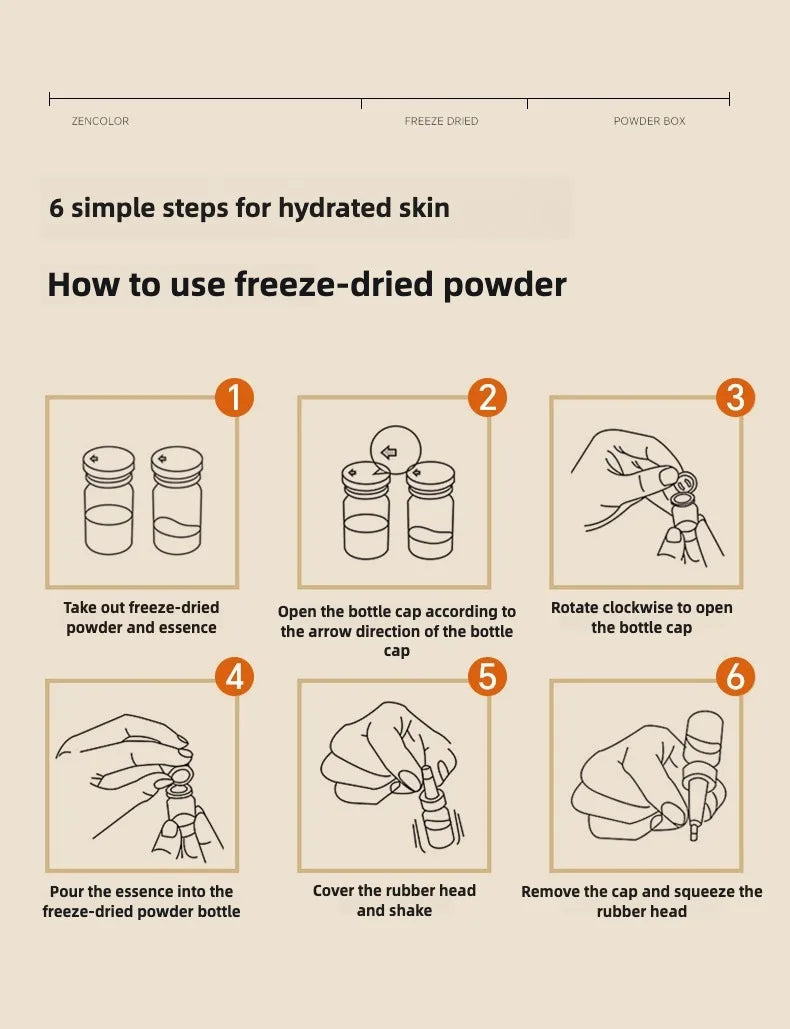 Instructions for use: After cleansing, take a bottle of freeze-dried powder and essence, mix the two together, cover the rubber head and gently wave until completely dissolved, take an appropriate amount to apply to the face, gently massage until completely absorbed. Apply an appropriate amount to the face and massage gently until absorbed.