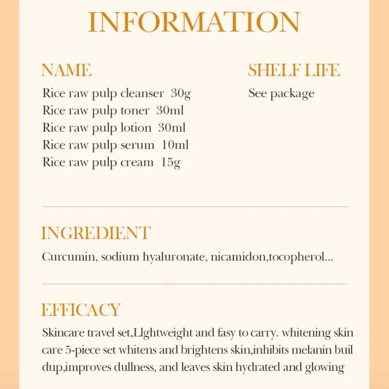 To achieve the best results with the BIOAOUA 5pcs Rice Raw Whitening Travel Set, begin by cleansing your face with the rice-based cleanser. Apply a small amount to damp skin, gently massaging in circular motions to remove impurities. Rinse thoroughly with lukewarm water. Next, use the toner to balance your skin's pH. Soak a cotton pad with the toner and swipe it across your face. Follow with the whitening serum, applying a few drops to your fingertips and gently pressing it into your skin. Finally, finish with the moisturizer, ensuring even coverage to lock in hydration. For optimal results, use this set twice daily, morning and night, and incorporate it into your skincare routine consistently.
