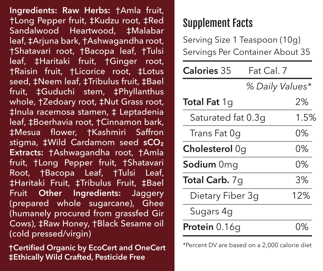 Our Authentic Chyawanprash is a time-honored Ayurvedic herbal jam crafted from a powerful blend of 42 botanical ingredients, aromatic spices & nutrient-rich fats. Rooted in a 5,000-year-old Vedic tradition, this Rasayana (rejuvenating formula) is designed to support longevity, vitality & overall well-being.