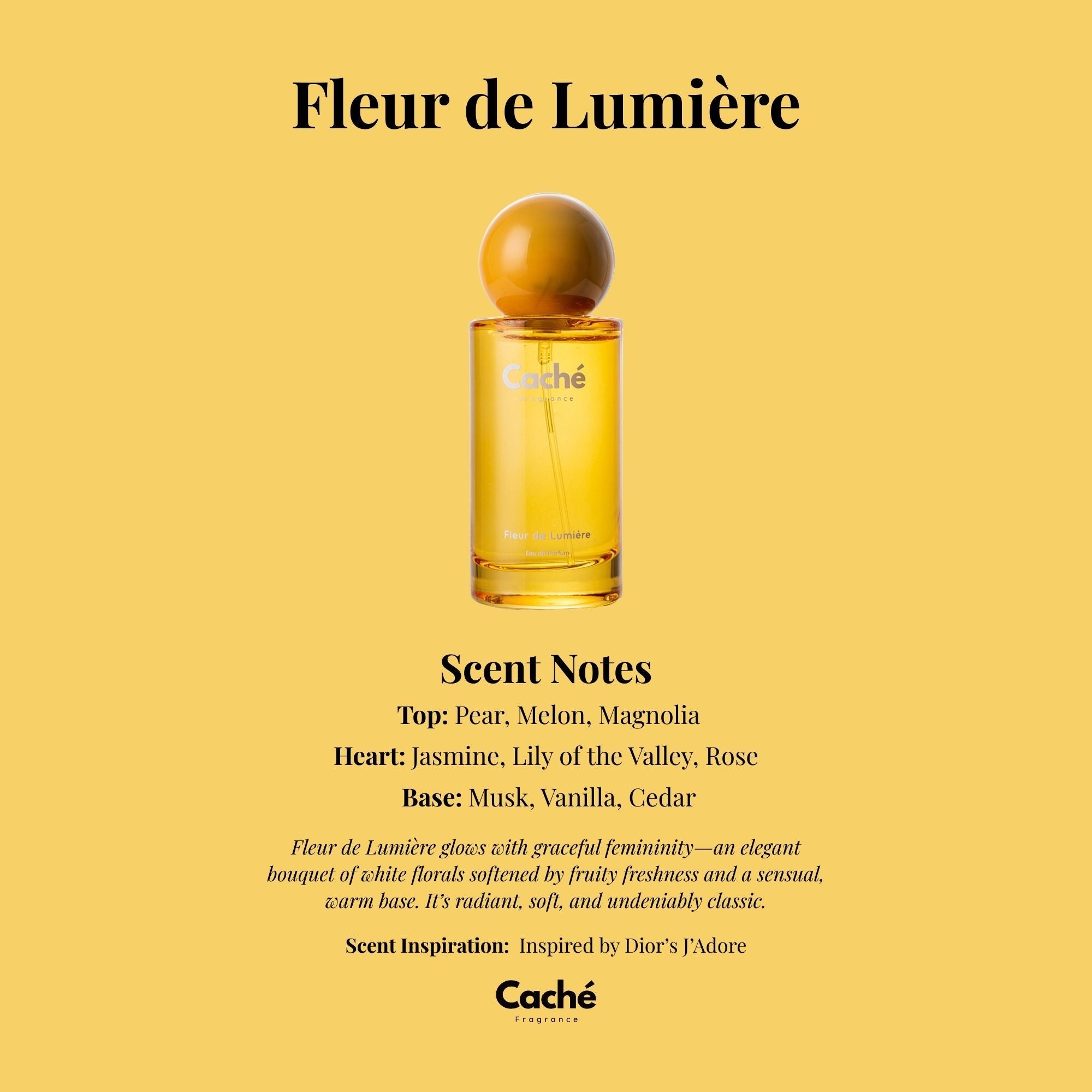 Fleur de Lumière is radiant elegance bottled. Inspired by J’Adore, it unfolds with ylang-ylang, jasmine, and rose, revealing a soft floral bouquet that glows from within. A touch of vanilla and cedar gives it lasting softness and depth. Feminine, graceful, and always polished—this scent is a golden aura in motion.