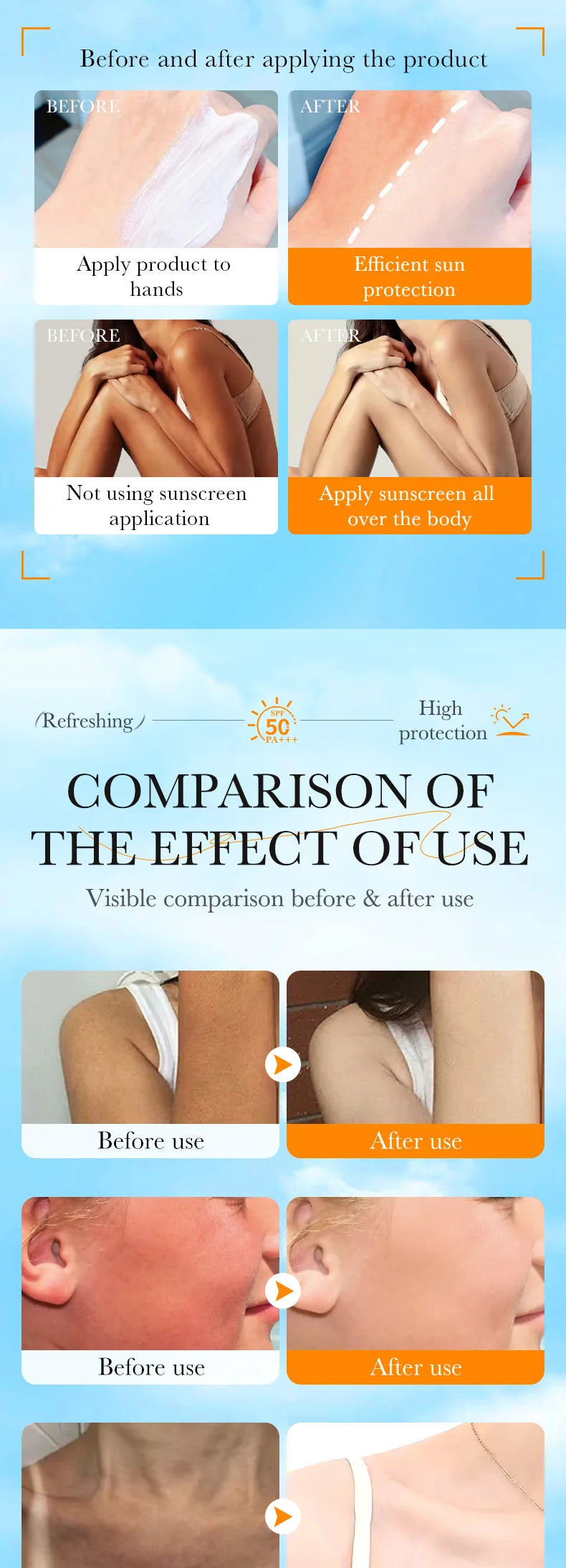 Refreshing and non-greasy, waterproof and sweat-proof, highly effective whitening sunscreen to protect against UV damage to the skin,no fear of sun exposure