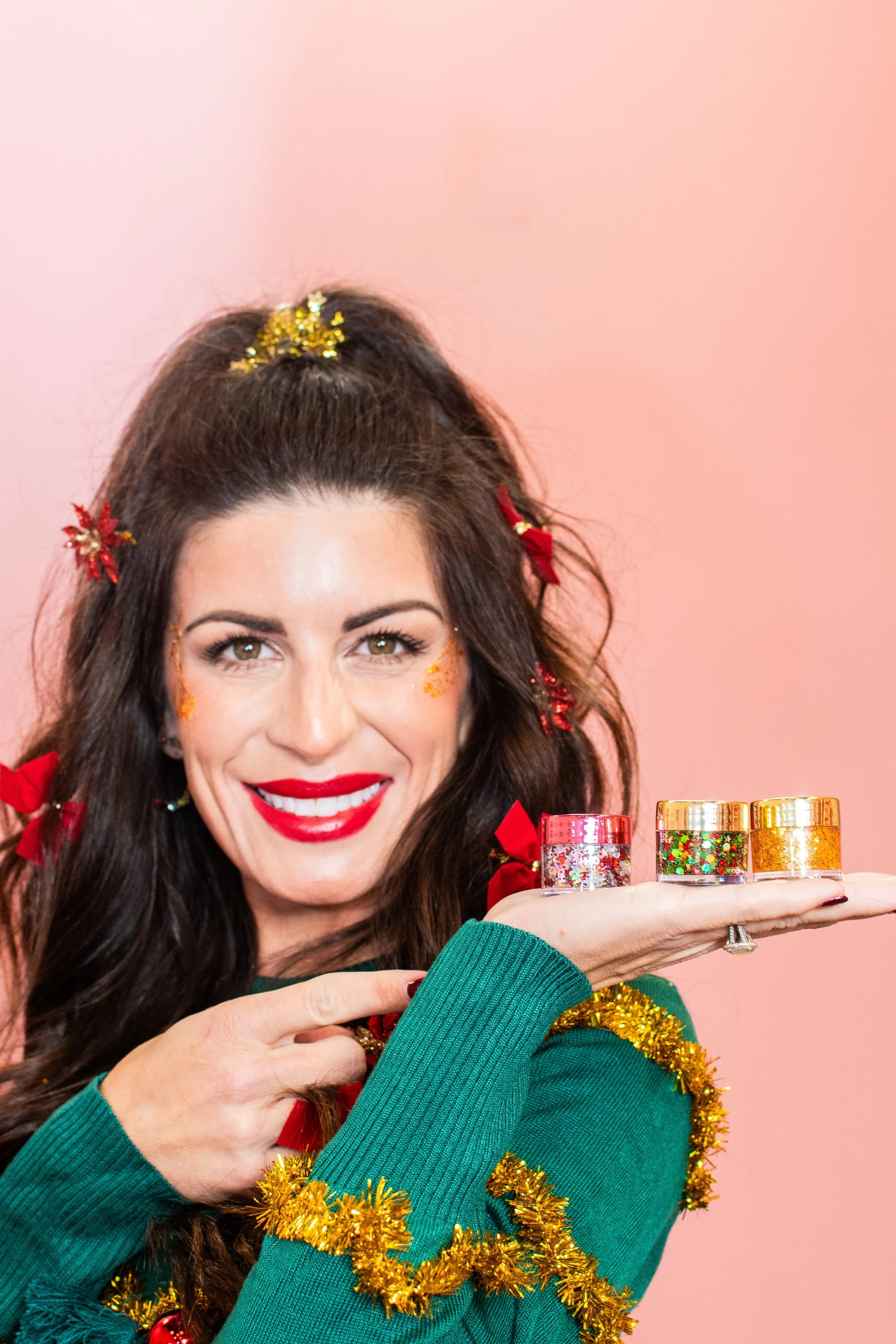 The FALALA Glitter Trio Bundle features three mini jars of festive face glitters, perfect for adding sparkle to your holiday look. Each jar contains a different glitter in vibrant Christmas colors and shapes. Perfect for adding a touch of shimmer to your festive makeup or holiday party look!