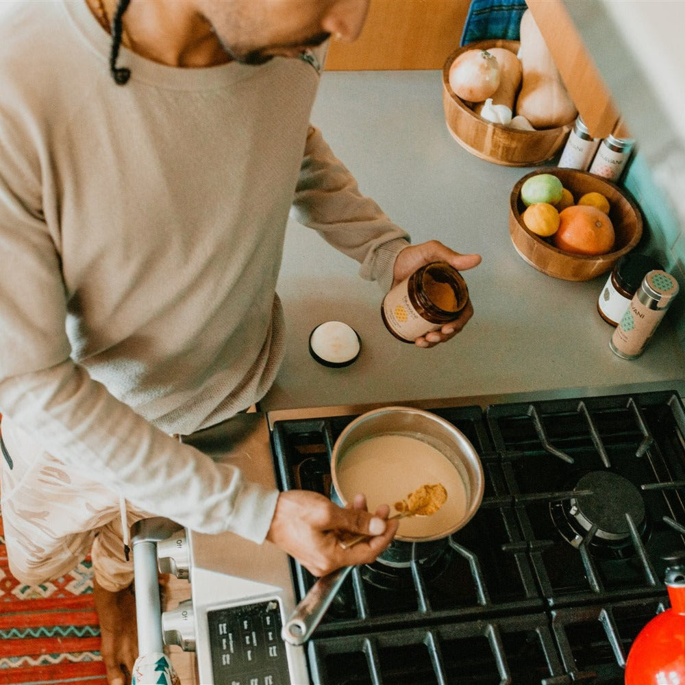 This golden tonic—traditionally known as Haldi Doodh—is a revered Ayurvedic elixir balancing to all doshas. Grounding herbs & spices such as turmeric, cinnamon, ginger & cardamom support healthy digestion, circulation & immunity. Meanwhile, adaptogenic ashwagandha & shatavari rejuvenate the body, nourish the nervous system & help ease the effects of daily stress.