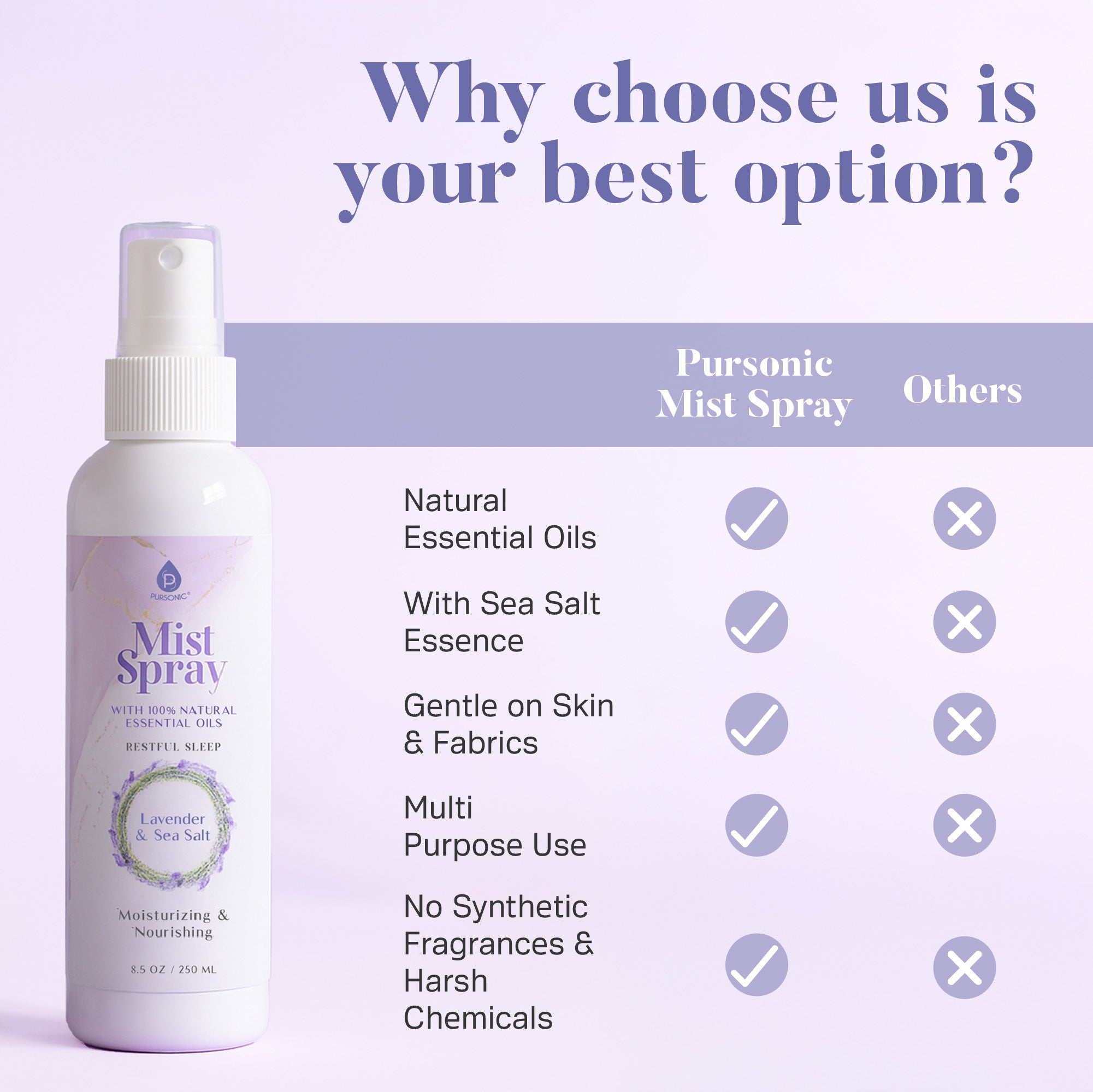 Whether you're winding down for the night, refreshing your space, or treating your senses to a midday pick-me-up, the Pursonic Mist Spray with Natural Essential Oils  delivers pure botanical bliss in every spritz.