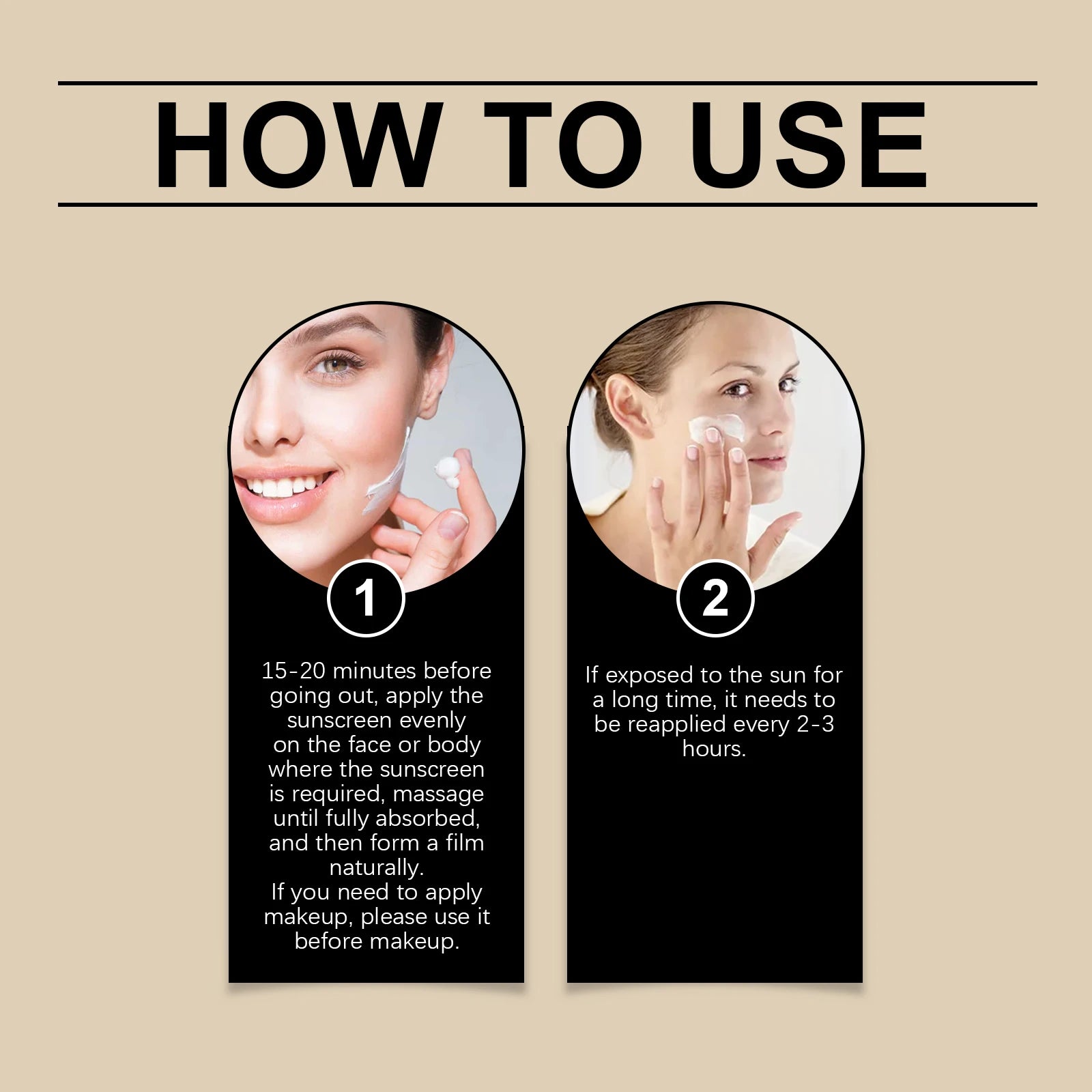 1.15-20 minutes before going out, apply the sunscreen evenly on the face or body where the sunscreen is required, massage until fully absorbed, and then form a film naturally lf you need to apply makeup, please use it before makeup